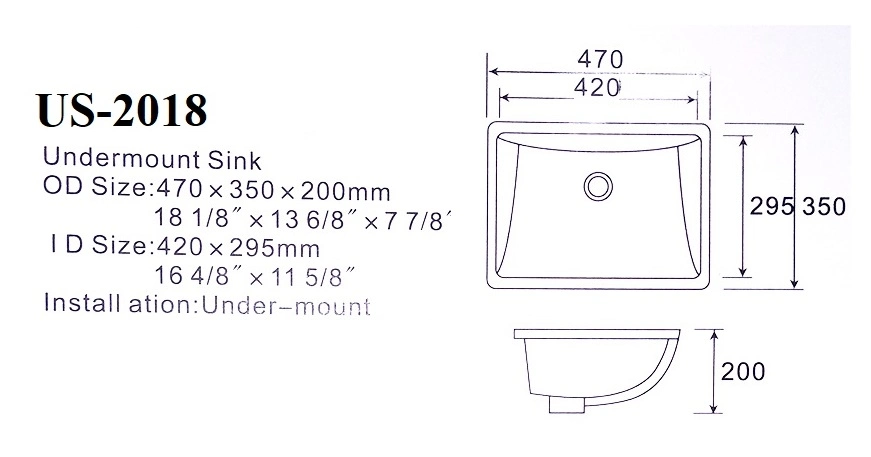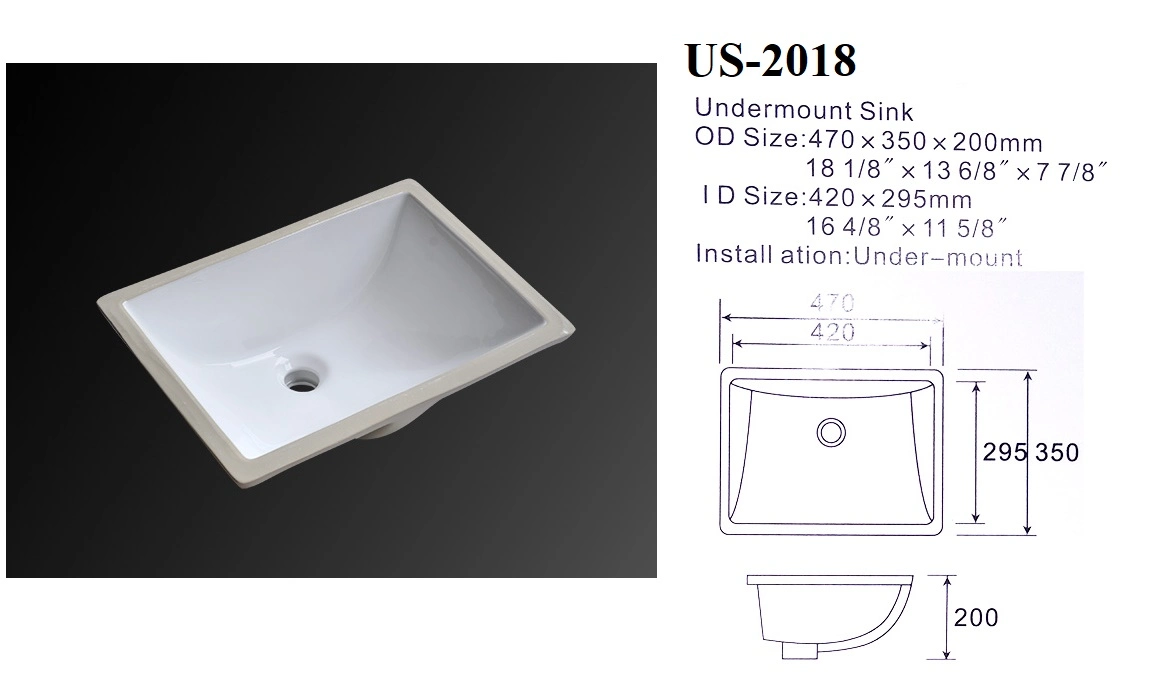 ITEM NO.2018under counter wash basinSize: 470x350x200mmOutter size: 18-1/8``x13-6/8``x7-5/8``Inner size: 16-4/8``x11-5/8``Unglazed rim, polished rimCUPC certifiedpackage, 1/3/5pcs in a carton. 5-ply carton boxabout 0.05CBM / pcquotation without faucet included. Place of Origin:Chaozhou,Guangdong Mo......